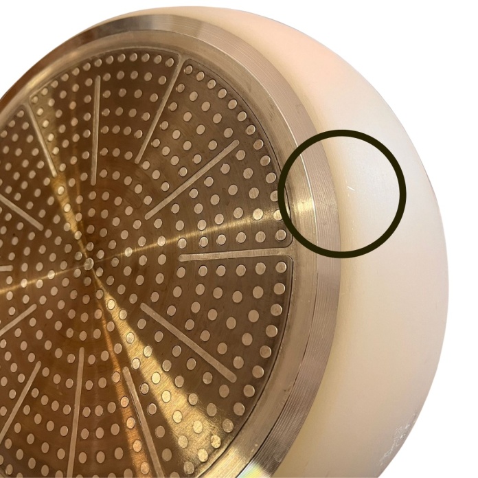 Patelnia posiada drobne rysy na powłoce zewnętrznej rysy widoczne na zdjęciu.